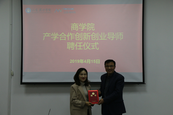 授牌仪式上我院同时聘任网中网副总裁刘青女士,华东二区总监刘莉女士为商学院产学合作创新创业导师,并由学校梁校长颁发聘书。