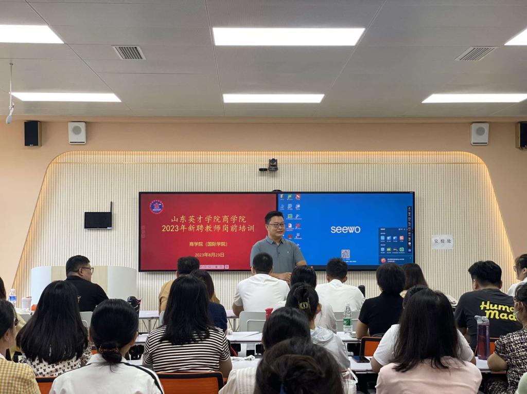 8月23日,商学院开展院级新聘教师岗前培训。商学院党总支书记、院长赵坤做主题发言,他表示,学院以培养“富有家国情怀和国际视野,通管理、重实践、善协作、能创业的高素质新商科应用型人才”为目标定位,不断更新专业建设理念,理清专业建设思路,探讨新商科专业建设路径。教学副院长殷永生对教师日常工作管理的规范以及如何提高教育教学质量做了充分细致的讲解。教学秘书代表丁伟老师以及实训中心谭建强主任分别对教学办公室和实训中心的人员配置、运行模式、工作流程等方面做了细致讲解。