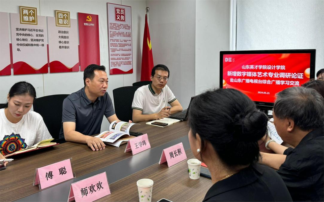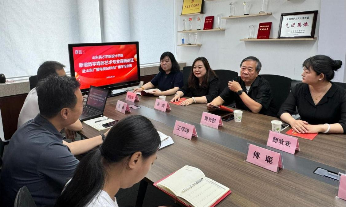 为进一步优化我院本科专业设置,更好地推动数字媒体艺术专业的申报和建设。旨在通过实地参观、交流座谈等方式,全面了解山东广播电视台在数字媒体艺术领域的最新发展动态、技术应用以及人才培养需求。2024年5月21日设计学院院长周长积,教学副院长郝莹,视传数媒系主任师欢欢,数字媒体设计专业负责人李俊峰及骨干教师,赴山东广播电视台进行考察调研。