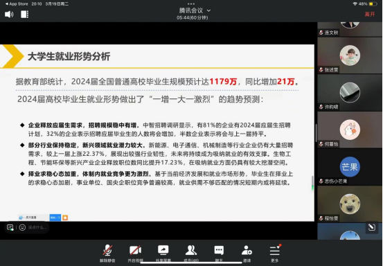 由于学生在外实习的影响,本次班会采用线上腾讯会议的形式进行,辅导员精心准备课件,通过精彩的演讲和丰富的案例展示,为学生们深入讲解了就业的各方面知识
